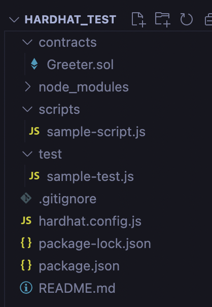 하드햇은 만들면 바로 왼쪽같이 기본컨트랙트, 배포 스크립트, 테스트폴더와 파일이 생긴다.